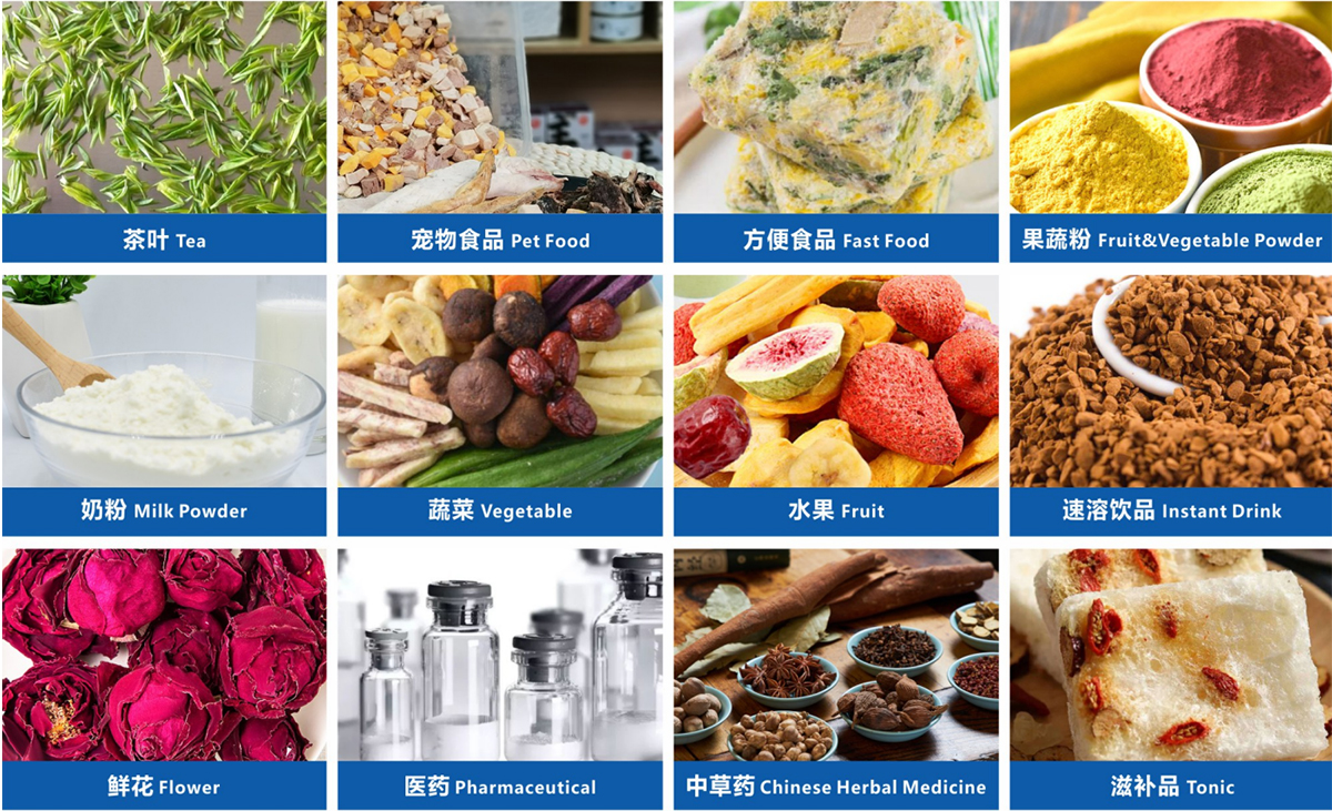 凍干機(jī)適用于食品、蔬菜、水果、植物提取物、中藥材、鹿茸、果粉、花卉、咖啡、海參、生物制品和化工物料等產(chǎn)品